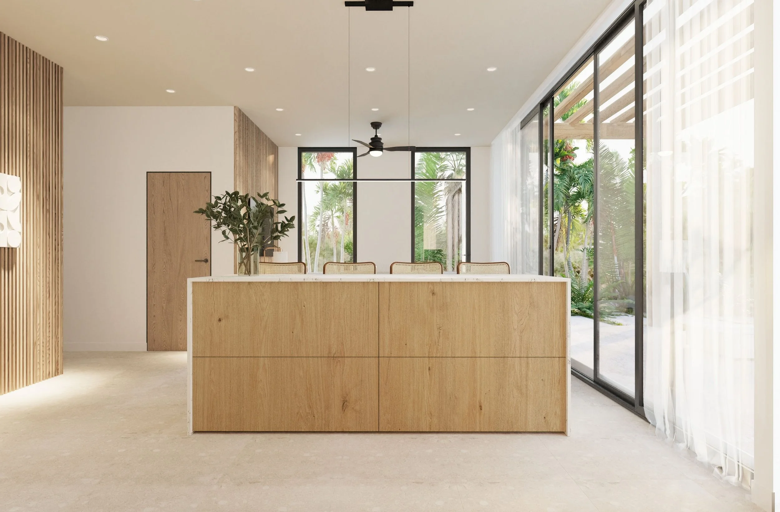 Los acentos en madera natural aportan calidez y textura, equilibrando la estética minimalista y generando una atmósfera relajada y acogedora en toda la vivienda.